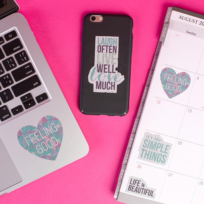 Create labels and stickers with a flashy look using Glitter Sticker Paper. This material has a printable surface and an adhesive backing. The glitter sparkle shines through printed images.
